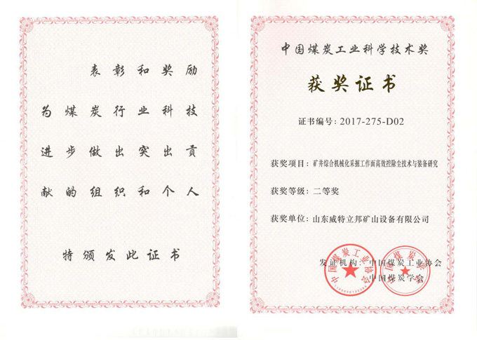 • 濟寧市首屆創新大賽“煤礦采掘面濕噴除塵系統設備”創新組二等獎